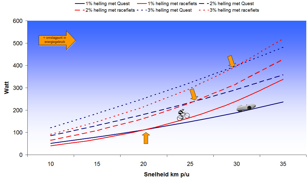 | Op een flauwe helling van 1% ligt het omslagpunt op 20 km per uur. Op een helling van 3% zou je met een Quest al meer dan 30 km p.u moeten rijden. |
